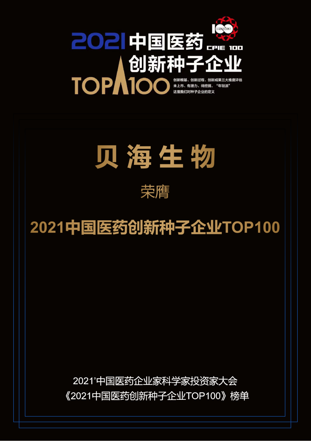 由中國醫(yī)藥企業(yè)管理協(xié)會、中國醫(yī)藥生物技術(shù)協(xié)會、中國農(nóng)工民主黨中央委員會辦公廳、杭州市投資促進(jìn)局主辦的2021’中國醫(yī)藥企業(yè)家科學(xué)家投資家大會于2021年12月21日~23日線上舉行。作為中國醫(yī)藥行業(yè)規(guī)格最高、影響力最強(qiáng)、規(guī)模最大的行業(yè)盛會,該大會已連續(xù)召開十二屆?;凇叭S度四指標(biāo)”評選體系,經(jīng)歷4個月數(shù)據(jù)篩選整合分析,生成“2021中國醫(yī)藥創(chuàng)新種子企業(yè)100強(qiáng)”榜單,該榜單于2021’中國醫(yī)藥企業(yè)家科學(xué)家投資家大會上正式發(fā)布。貝海生物榮登“2021中國醫(yī)藥創(chuàng)新種子企業(yè)100強(qiáng)”榜單。